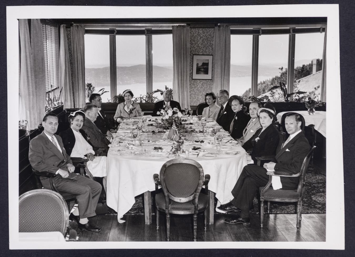 Prúðbúið fólk situr til borðs. Út um gluggann á bakvið þau má greina fjörð og fjöll. Yfirskrift greinarinnar með myndinni er: Á ferð um Noreg með forsetahjónunum: Borgin vestan fjalla. Undir myndinni stendur: Í veitingasal á Flöjen, talið frá vinstri: Hinrik Björnsson forsetaritari, frú Ritland, Árni Óla, Bjarni Guðmundsson blaðafulltrúi, Ásta Jónsdóttir sendiherrafrú, Ritland konsúll Íslendinga í Bergen, frú Mohr, forseti Íslands herra Ásgeir Ásgeirsson, frú G. Björnsson, Bjarni Ásgeirsson sendiherra, forsetafrú Dóra Þórhallsdóttir, Mohr ríkisstjórnarstallari.