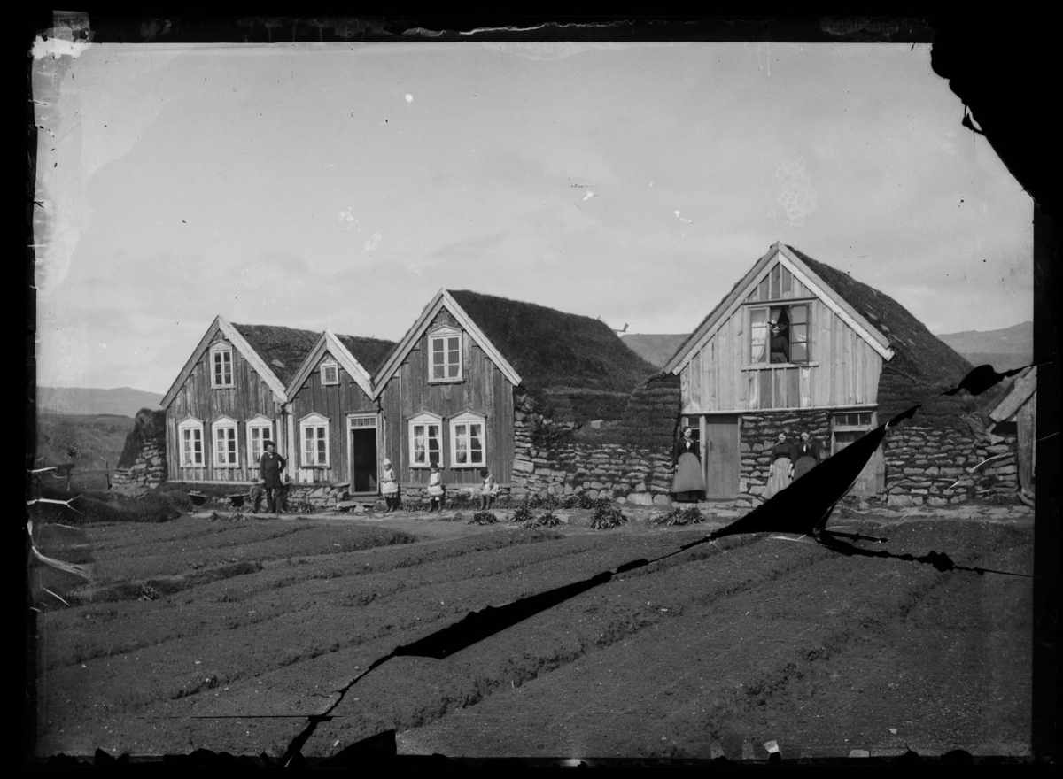 torfbær. Matjurtagarður framan við húsið. Fólk