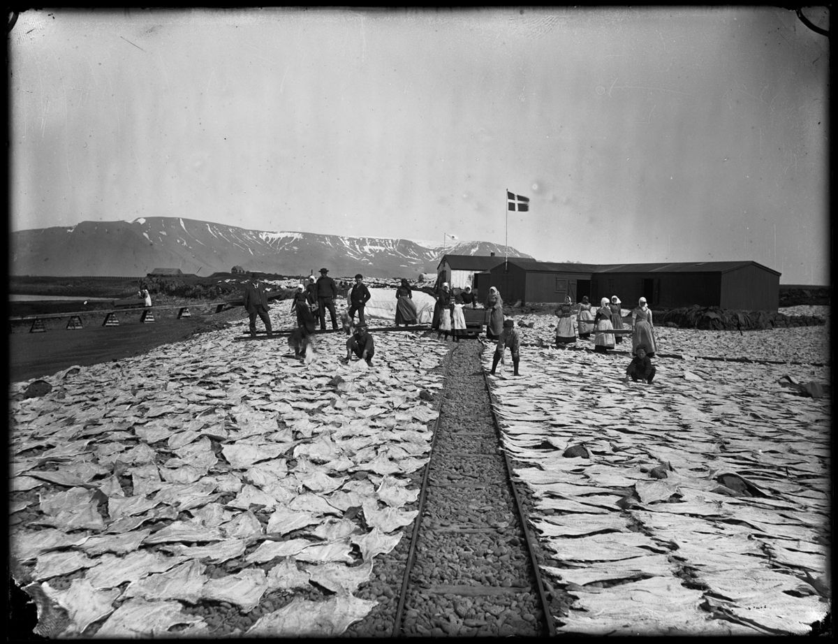 Fiskbreiðsla. Konur og börn að störfum. Tveir menn standa hjá. Vagnar og vagnteinar liggja um stakkstæðið og út á bryggju og eru konur að aka vagni niður á hana. Einnig halda konurnar á handbörum. Fiskverkunarhús og blaktir danski fáninn við hún. Yfirbreiddur fiskur í stæðum. Bær fjær. Fjöll. Hér má þekkja Th. Thorsteinson útgerðarmann lengst t.v. og son hans Geir með derhúfu og í röndóttum bol. Tímasetning byggir á aldri Geirs sem er fæddur 1890 og er hér 10-12 ára.