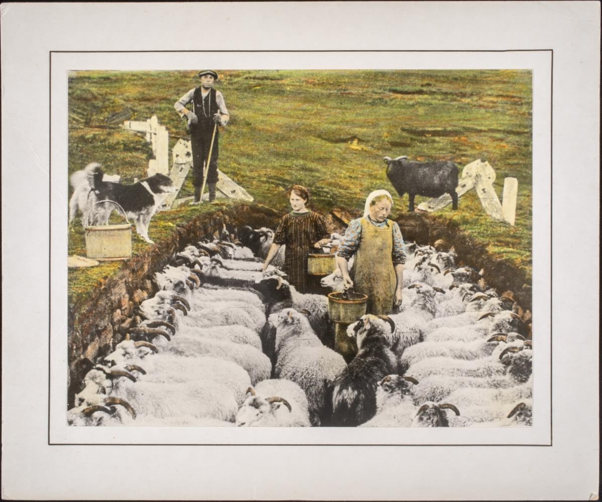 Ær í kvíum á Böggvisstöðum í Svarfaðardal. Í kvíunum eru 2 mjaltarkonur með fötur, Guðrún Friðfinnsdóttir, seinna húsfreyja á Böggvisstöðum og Steinunn, úr Ólafsfirði. Á kvíaveggnum standa 2 hundar og 1 kind, auk smalans, Jóhann Guðjónsson, seinna útgerðarmaður i Keflavík.