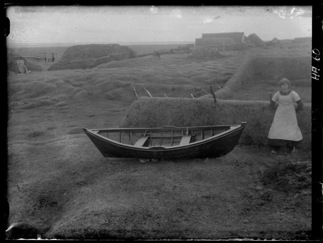 hlöður, ósbátur smíðaður 1917 (notaður til selveiða). Guðný Aradóttir stendur