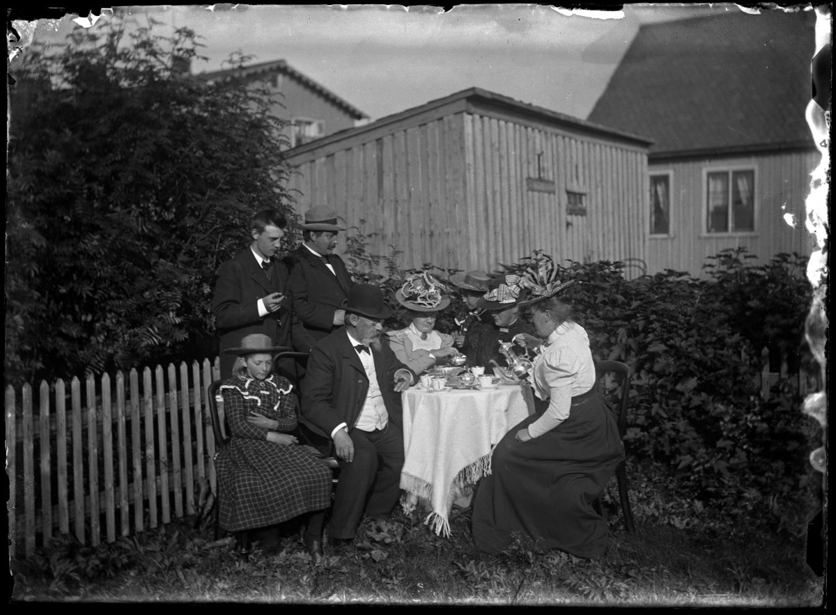 Reykjavík. Lækjargata. Hópur fólks situr við dúkað borð úti í garði og drekkur kaffi. Hár má þekkja Eggert Claessen sem stendur t.v. og Jónas Jónassen sem situr. Allir nema Eggert eru með hatta og því erfitt að greina andlit fólks.