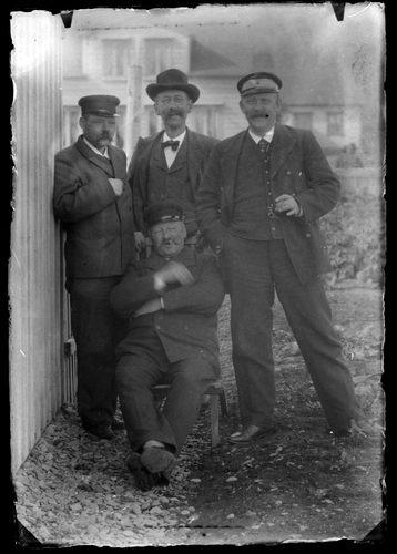 28. Sauðárkrókur. Fjórir menn í jakkafötum upp við húsvegg. Þrír með kaskeiti og einn hatt. Eitt kaskeitið er sýslumannshúfa. Í baksýn einlyft timburhús með mijukvisti. Kristján Þ. Blöndal, Þorvaldur Arason á Víðimýri og Gísli Ísleifsson sýslumaður standandi en Jean Valgard Claessen sitjandi.