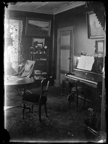3. Reykjavík. Lækjargata. Stofa með borði, stólum, hillu og píanói. Málverk á veggjum og ljósmyndir bæði á hillu og píanói. Sér í glugga með blúndugardínum, spjaldaloft og spjaldahurð sem máluð er í fleiri litum.