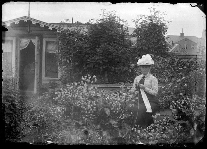 37. Reykjavík. Lækjargata 8. Sparibúin kona með hatt situr úti í garði og heklar. Blómaskrúð, runnar og garðhús. Hús með miðjukvisti í fjarska í baksýn. Bakgarður við hús Jónasar Jónassens. Í fjarska sér í Melsteðshús við Austurstræti. Konan er líklega Sophia Claessen.