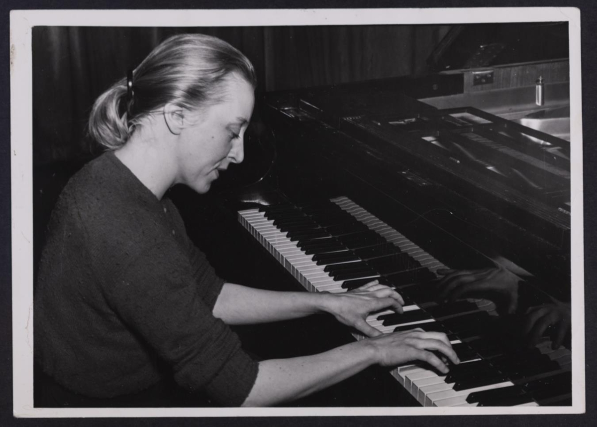Kona sitjandi og spilandi á píanó.