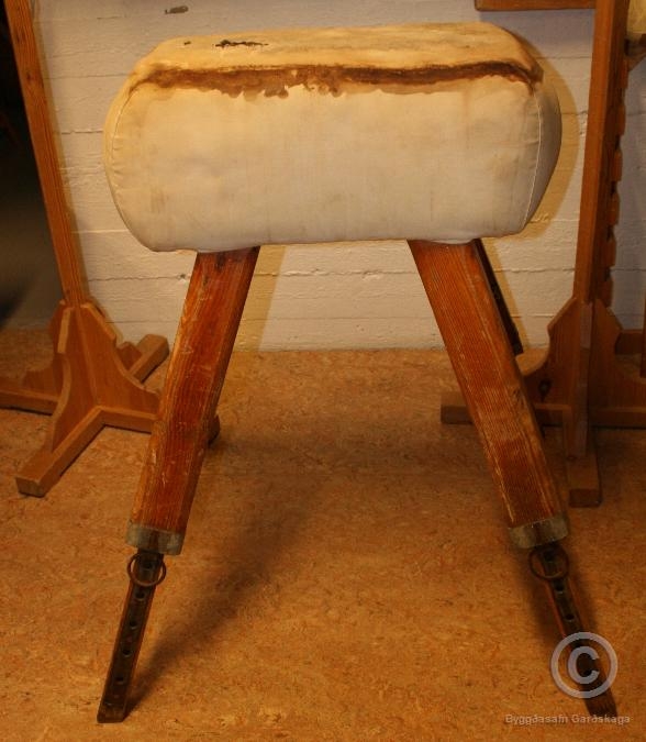 Hestur, íþróttatæki úr íþróttasal Gerðaskóla í Garði. Hægt er að hækka fætur hestsins upp eða niður eftir þörfum. Þetta tæki var mikið notað í íþróttasalnum í Gerðaskóla, farið að sjá verulega á áklæðinu.
