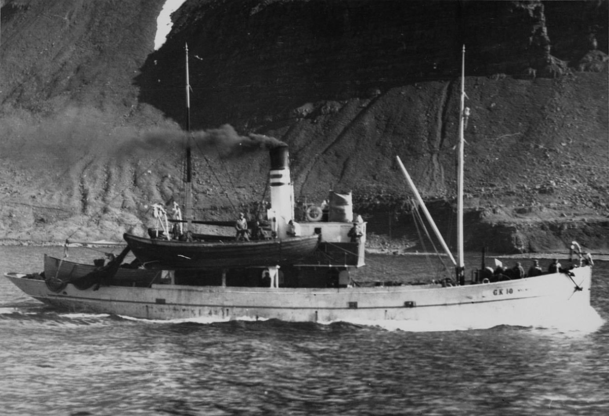 Gufuknúinn, umbyggður kútter, séð þvert á stjórnborða. Stór björgunarbátur hangir í uglum við hlið yfirbyggingarinnar og annar árabátur liggur á afturdekki. Sjómenn greinilegir um borð. Á kinnungnum má sjá stafina: GK 10. Á bakhlið er skrifað: „90% Málmey (ex Golan)“.