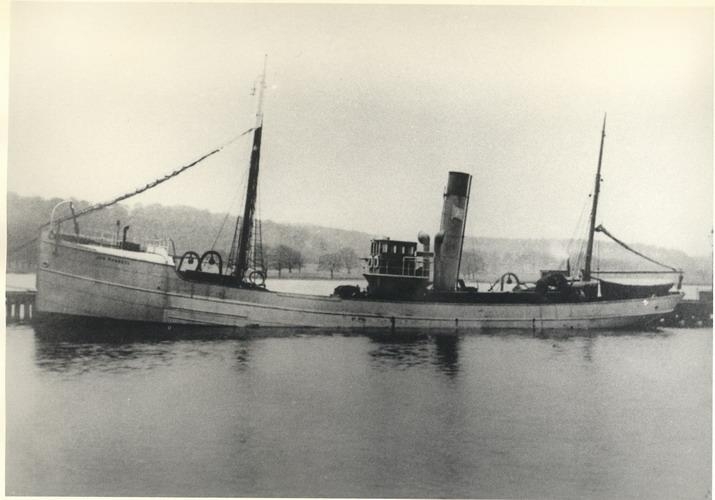 Gufuknúinn síðutogari við lága bryggju, séð þvert á bakborða. Á kinnungnum má sjá stafina: JÓN FORSETI, og á reykháfnum málaður fáni með „A“ í miðju. Í bakgrunni er skógi vaxið land.