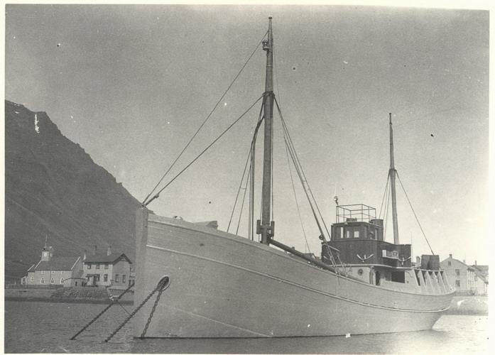 við akkeri, í baksýn sér í þorp á fjarðareyri, kirkja yst t.v. Hátt fjall
