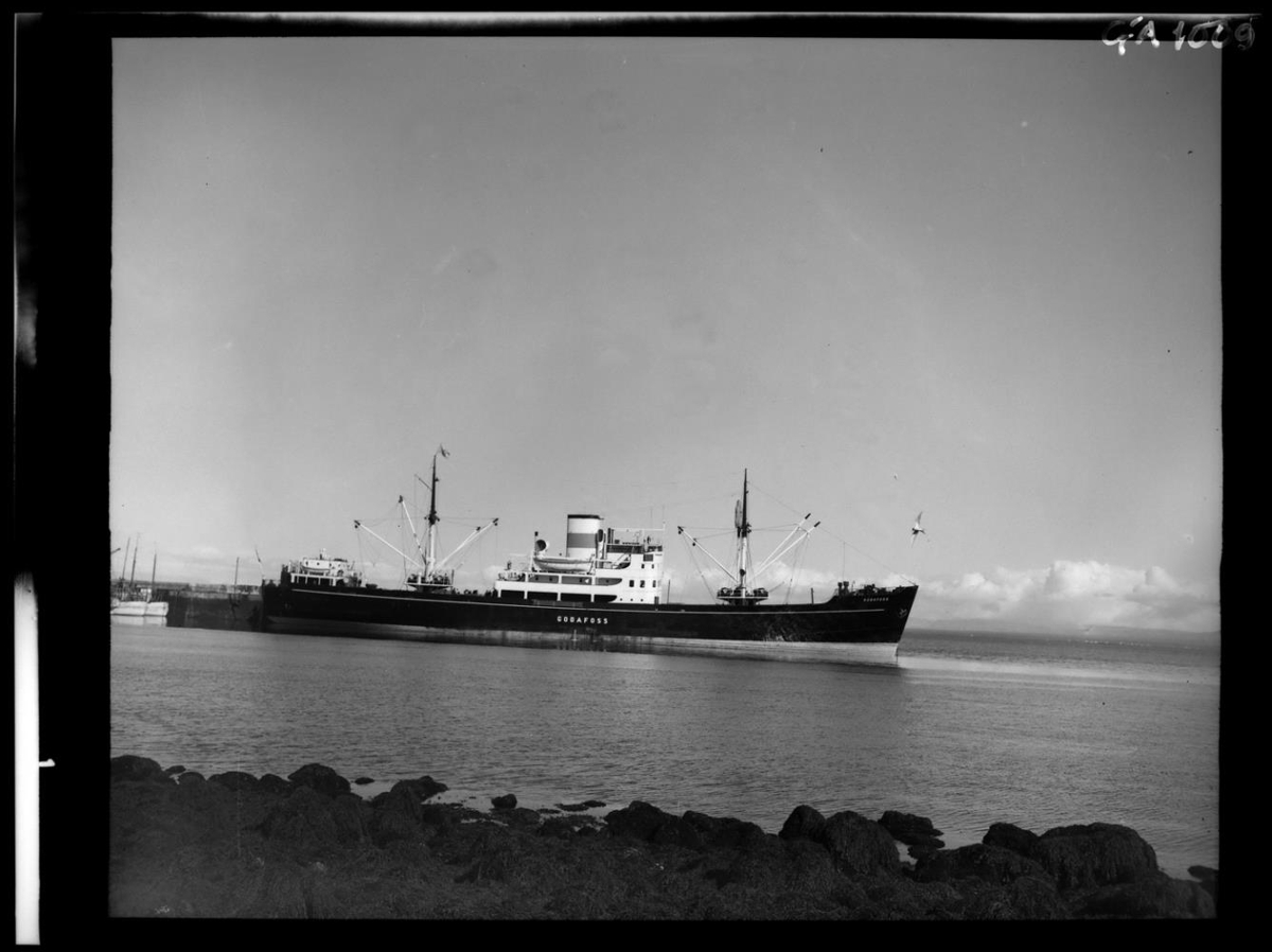 M.s. GOÐAFOSS (III). Myndin er tekin í ókunnri höfn, líklega á Íslandi, á tímabilinu 1948-1950. Tímasetning miðast við komudag Goðafoss til landsins og ennfremur hverning skipið er á litinn. 1948-1950 var Goðafoss svartur á skrokkinn. Jóans Böðvarsson, skipstj., tók við Goðafossi árið 1950 og lét þá mála hann hvítan, en það þótti ekki passa. Skömmu síðar var því skipt um lit á skipinu og það málað grátt og þanning var það eftirleiðis. - G.Á. var á Goðafossi (III) 1948-1958.
