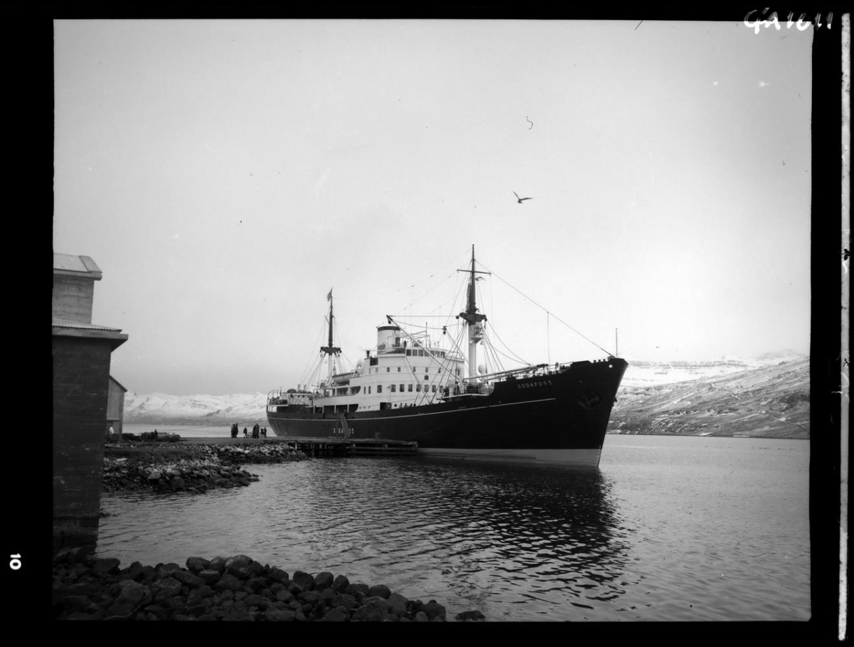 Myndin er tekin í ókunnri höfn, e.t.v. á Austfjörðum, á tímabilinu 1948-1950. Tímasetning miðast við komudag Goðafoss til landsins og ennfremur hverning skipið er á litinn. 1948-1950 var Goðafoss svartur á skrokkinn. Jóans Böðvarsson, skipstj., tók við Goðafossi árið 1950 og lét þá mála hann hvítan, en það þótti ekki passa. Skömmu síðar var því skipt um lit á skipinu og það málað grátt og þanning var það eftirleiðis. - G.Á. var á Goðafossi (III) 1948-1958.
