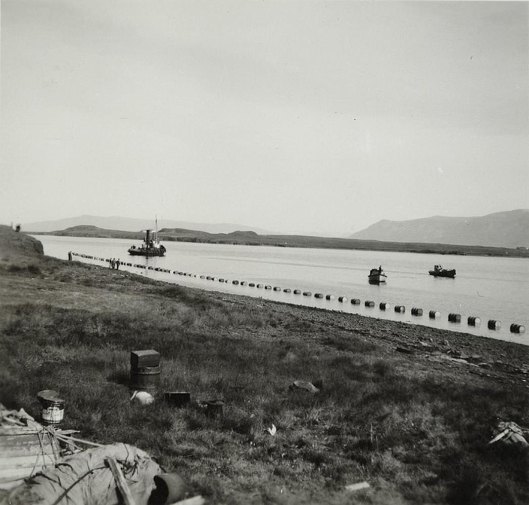 Úti á sundinu er dráttarbátur við enda leiðslunnar. Í baksýn er eyja með