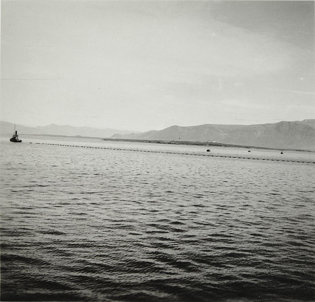 út frá honum. Í baksýn t.h. er lág eyja með tveim húsum á hæsta punkti.