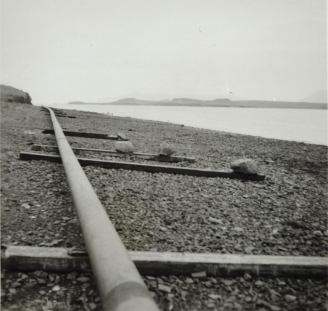 henni liggur vatnsleiðsla á tréplönkum. Í baksýn er eyja með nokkrum klettahólum.