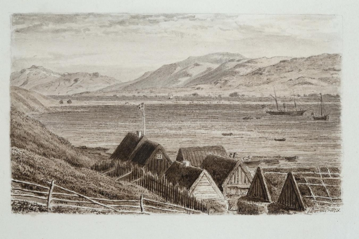 Horft út eftir Eyjafirði yfir Oddeyrina og til fjalla handan fjarðar. 6 hús ofan v. Höepfnersbryggju í forgrunni og sést í hana.