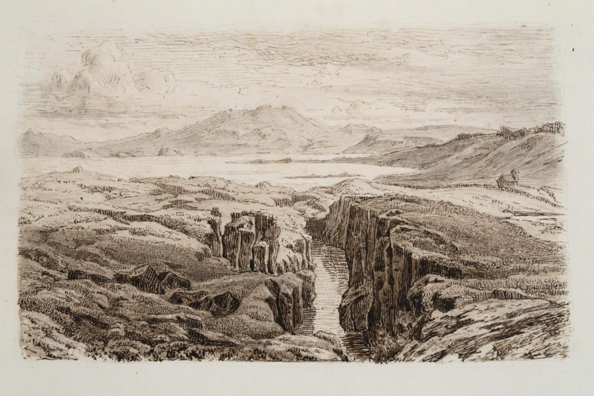 Flosagjá í forgrunni. Krikjan sést t.h.