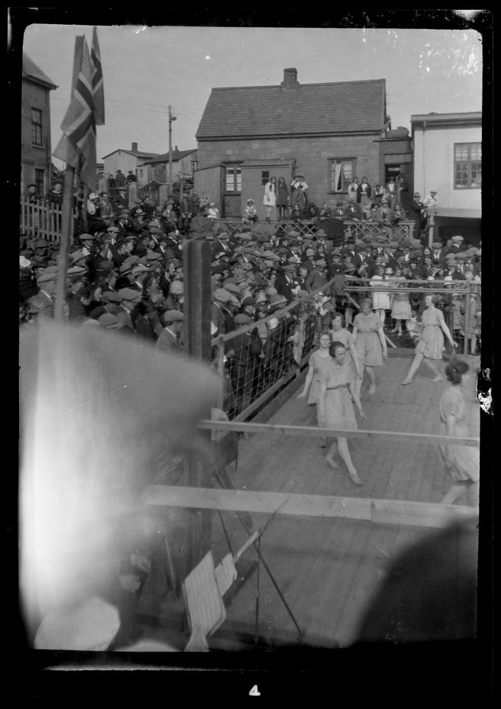 sýndir á trépalli. Mikill mannfjöldi fylgist með og sér í fáein hús