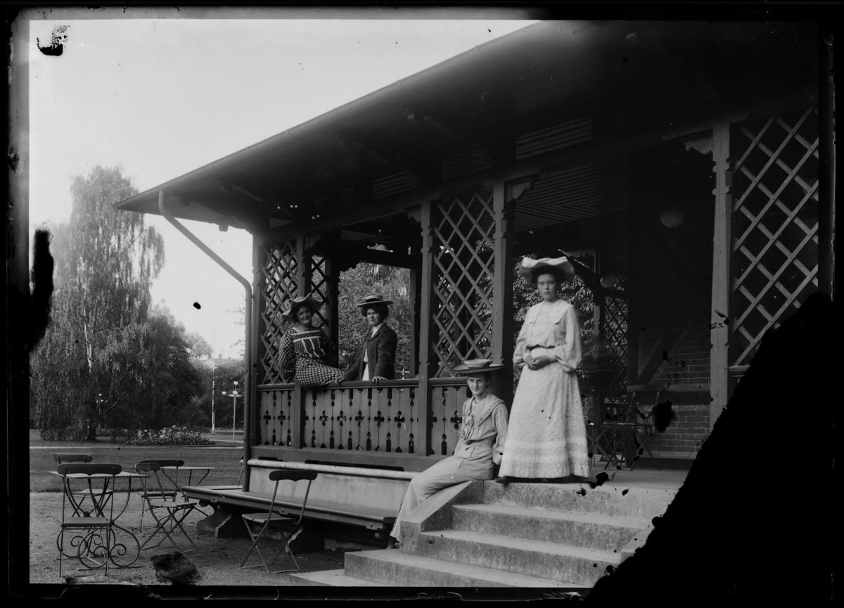 ungar konur á yfirbyggðum palli eða svölum við múrsteinshús. Guðrún