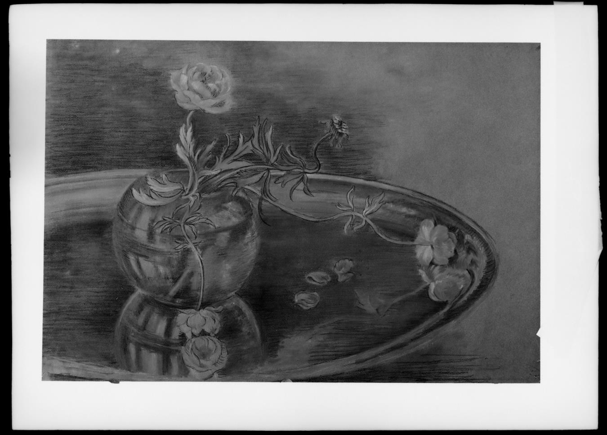 í kúlulaga vasa á bakka. Eftir Hönnu Davíðsson.