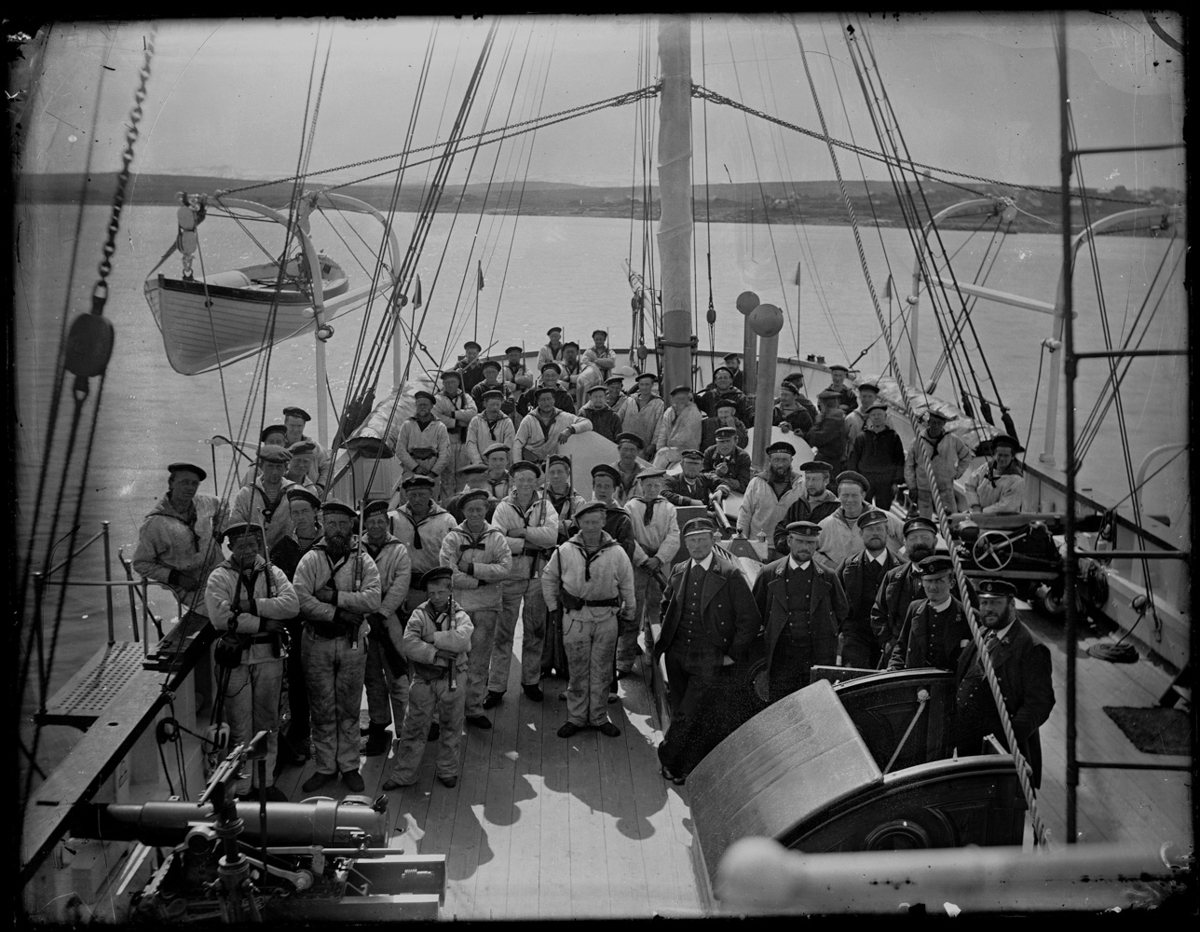 Áhföfn. Sjóliðar í matrósafötum með matrósahúfum og yfirmenn í jökkum með kaskeiti á þilfari skips. Rúmlega 60 manns. Fallbyssur ganga út um göt við borðstokkinn. Björgunabátur hangir í gálga. Diana e/s.