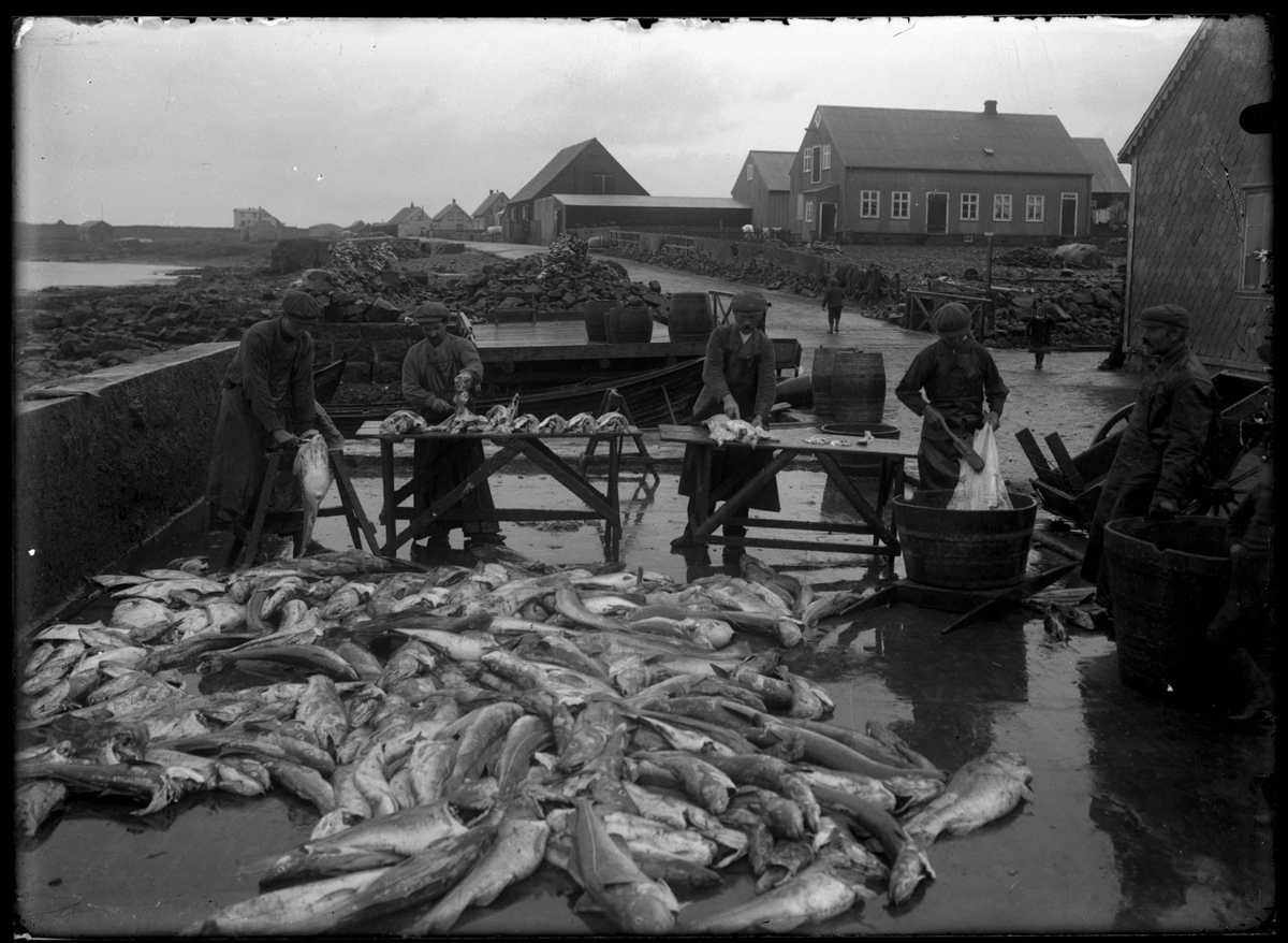 „Þessi mynd birtist í bókinni Saga Keflavíkur 1890-1920., höf Bjarni Guðmarsson, bls 141. Í texta við mynd segir "... Hér má sjá aðgerð á Duusplani, f.v.: Einar Sveinsson að hausa, Þorsteinn Þorvarðarson að "kútta", Högni Ketilsson að fletja og Jón Valdimarsson að vaska. Einar Sigmundsson stendur lengst til hægri og á milli þeirra Jóns sér í börnin Friðrik Þorsteinsson og Jakobínu Petersen.“ (DÓ 2018)