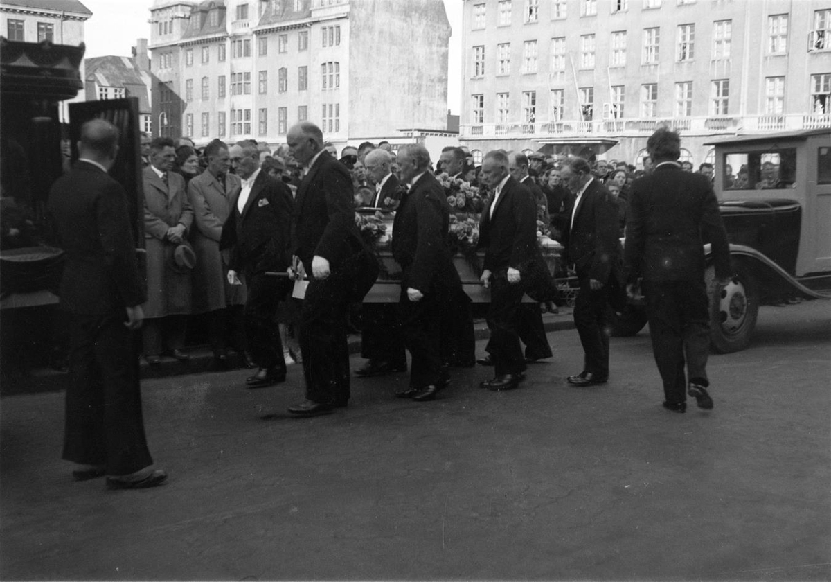 Líkmenn setja líkkistuna inn í líkbílinn. Jarðarför Guðrúnar Lárusdóttur og dætra 1938. Ólafur Thors, Árni Jónsson frá Múla, Bjarni Benediktsson og fleiri líkmenn