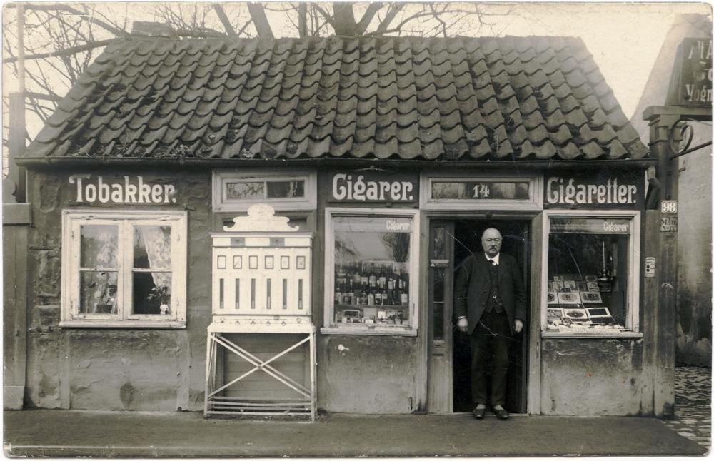á Amager. Í búðardyrunum stendur kaupmaðurinn sjálfur.