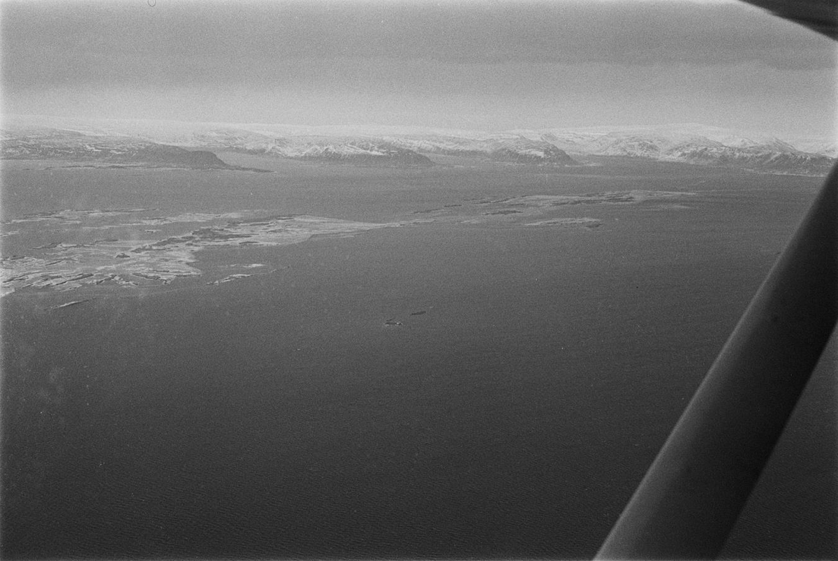 Tekið úr flugvél. Sér yfir sjó og til fjalla. Snjór í fjöllunum.