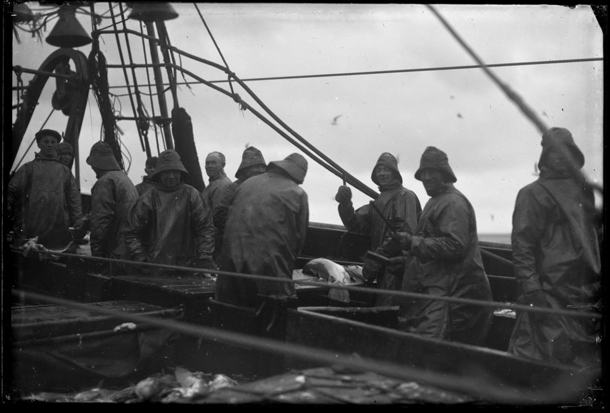 Fiskaðgerð um borð í togara. Flatningsborð, hnífar, brýni. Flestir mannanna með sjóhatta og allir á stökkum. Ullarvettlingar á höndum. Gálgi og vantur t.v. Vírar í forgrunni. Vinnuljós í efra v. horni. Tekið árið 1930 sbr. GÁ 92. Mannskapur á mynd frá vinstri: