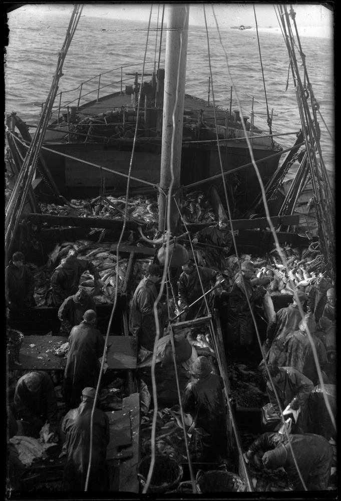 Fiskaðgerð um borð í togara. Tekið yfir þilfarið. Menn á sjóklæðum (stakkar, sjóhattar, derhúfur), sumir berhöfðaðir. Flatningsborð, tágakörfur, vinnuljós, stingir (goggar). Þilfarið hólfað sundur (kassar) og töluvert af fiski á því.