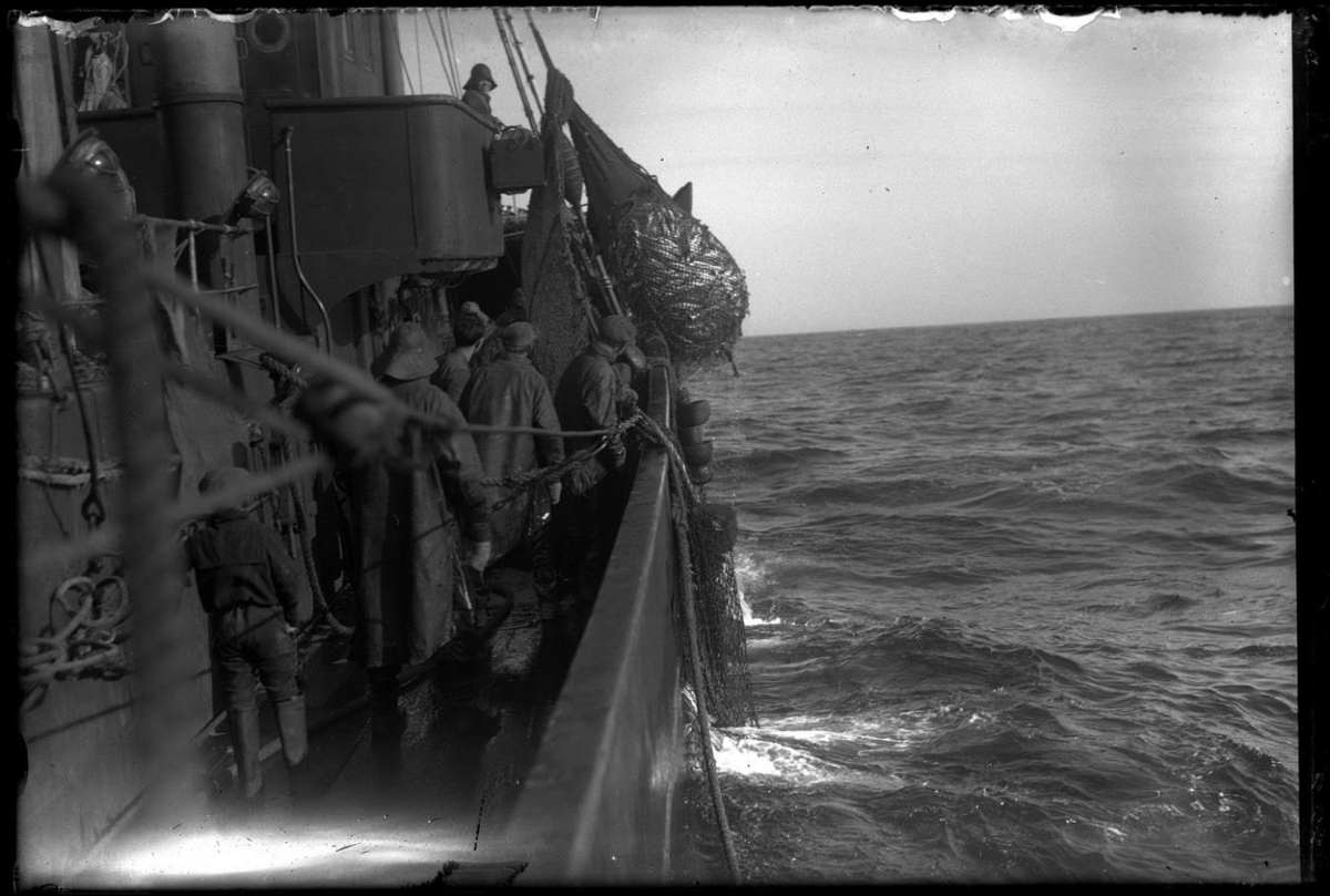 Fiskveiðar á togara. Pokinn fullur (á trollinu) við borðstokkinn, verið að hífa inn. Sést stjórnborðsmegin á skipið, aftan frá keis og fram úr. Drengur á brúarvæng, annar aftast á dekki, auk nokkurra manna framar. Trébobbingar á síðunni.