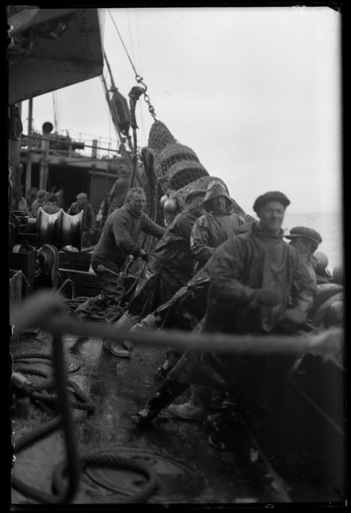 Um borð í togara að veiðum og tekið stjórnborðsmegin. Sér undir brúarvæng að hvalbak. Menn á dekki að ýta trollinu útbyrðis. Trébobbingar. Spilkoppur. Framar á skipinu nokkrir sjóklæddir menn. Á myndinni eru flestir á stökkum og ýmist með derhúfur og sjóhatta. Einn berhöfðaður og á peysu.