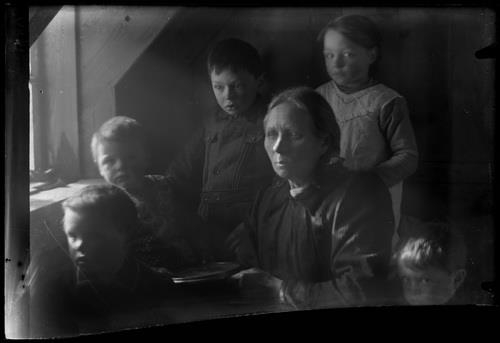 Sigurbjörg Gunnarsdóttir á Egilsstöðum, mamma Vigfúsar Sigurðssonar ljósmyndara. Fyrir aftan Sigurbjörgu er Sigríður, þá Snorri t.v., Sigurbjörg og Stefán. Fremst og neðst t.h. Sigurður. Börn Gunnars Sigurðssonar bróður ljósm. og Bergljótar Stefánsdóttur á Egilsstöðum, Fljótsdal.