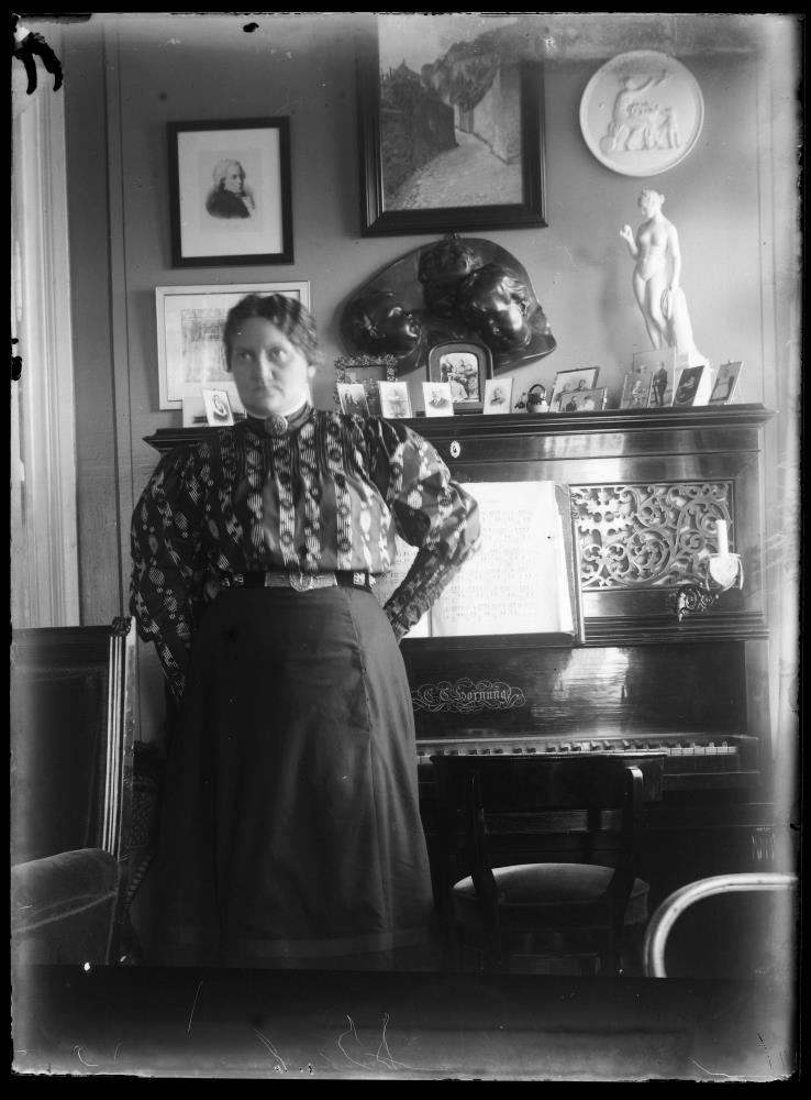 72. Kona stendur upp við píanó í stofu. Ofan á píanóinu eru margar litlar mannamyndir og stytta og uppi á veggnum er gifsplatti og myndir. Kristín Þorvaldsdóttir 1907.