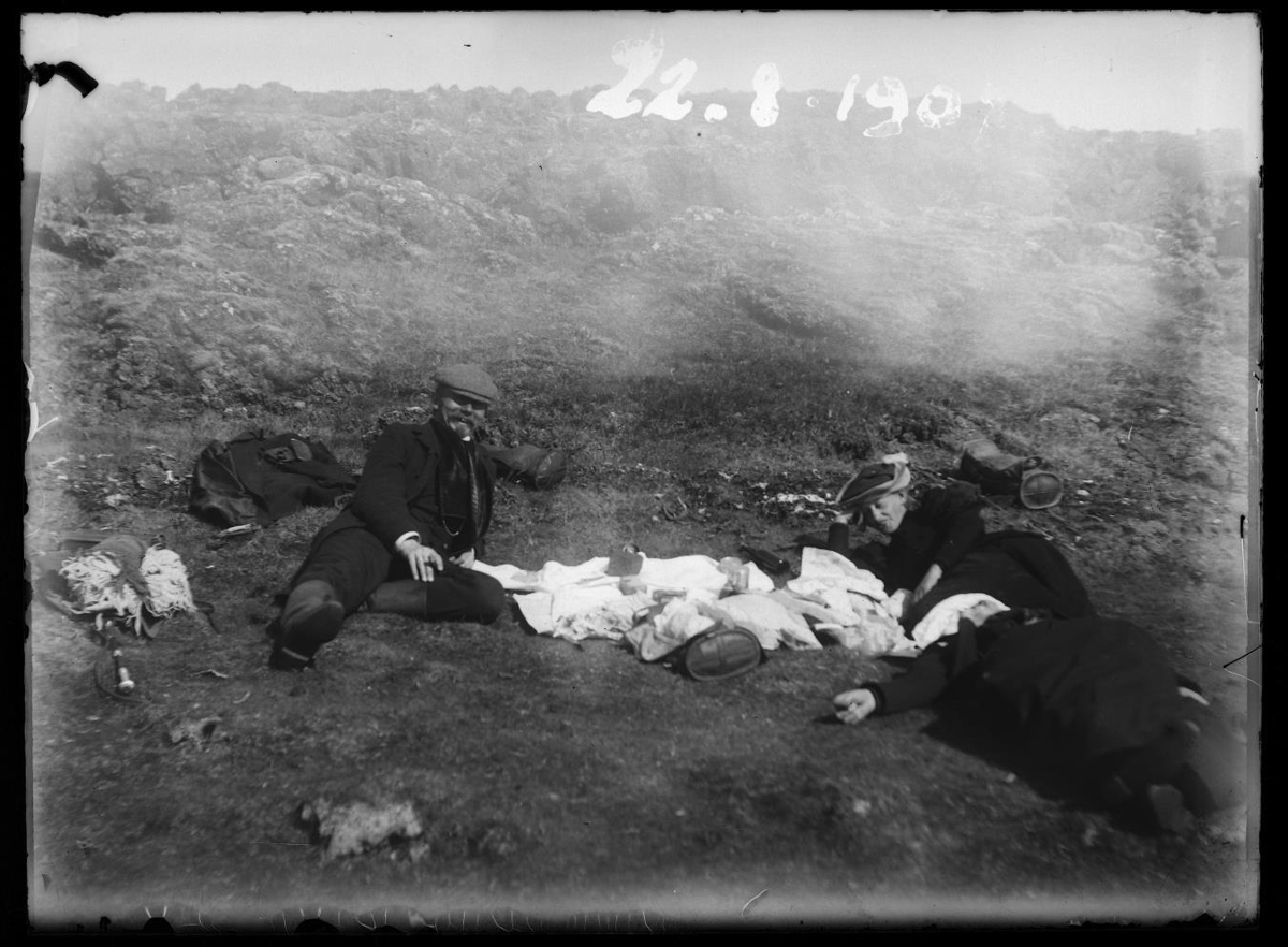 Áning. Tvær konur og karl liggja í grasi með reiðtöskur og dúk á milli