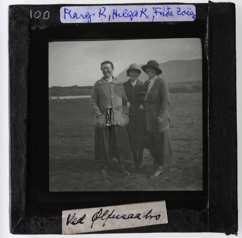 konur standa á velli. Á og fjall í baksýn. Jófríður Zoëga, Helga og Margarethe