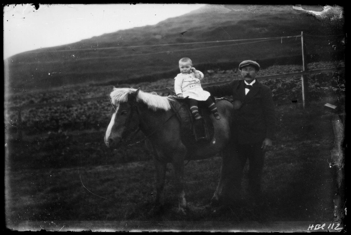 Högni Guðnason í Laxárdal í Gnúpverjahreppi með barn á hesti.