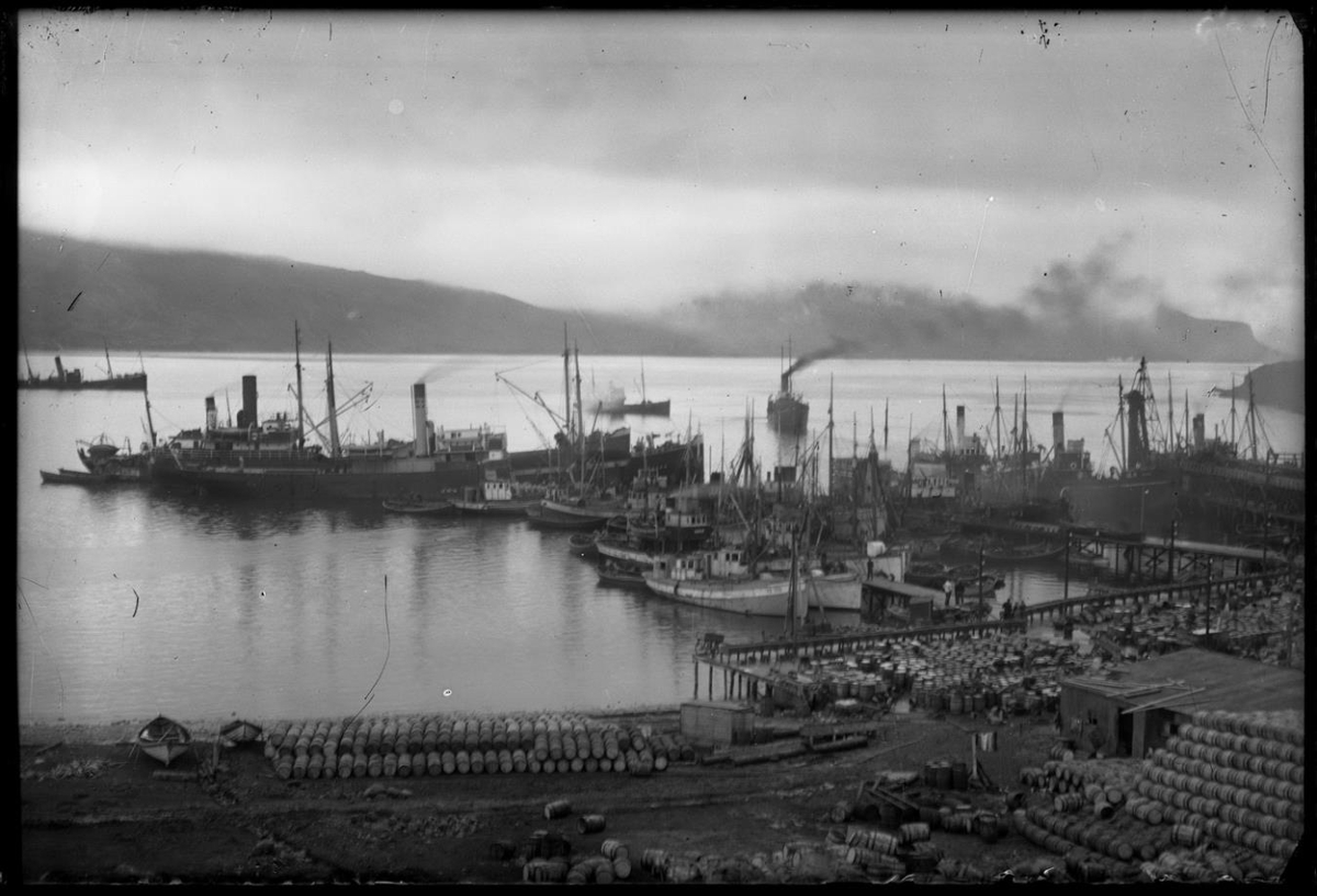 Síldarpláss. Í forgrunni tunnustaflar, síldarplan, tveir skúrar og t.v. tveir litlir bátar. Bryggjur og við þær bátar af mismunandi stærðum: Fiskibátar, togarar, flutningaskip, nótabátar. Lengst t.h. er löndunarbryggja og krani. Á tveimur skipum má lesa skráningarnúmer: VE 316 og GK 4. Í bakgrunni fjörður og fjöll, mikið til hulinn af þoku. Úti á firðinum liggja tvö skip, togari og línuveiðari. Ennfremur togari á siglingu að bryggju.