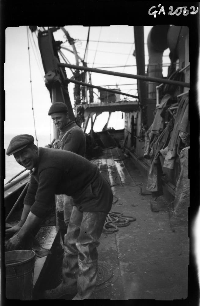 Tekið um borð í togara og sér aftur eftir honum. Tveir menn standa við borðstokkinn. Sá sem nær er hallar sér áfram og er að þvo pall eða tröppu við borðstokkinn. Klæddur klofstígvélum, buxum, peysu (með uppbrettar ermar) og derhúfu. Við hlið hans, en fjær, stendur maður klæddur smekkbuxum og peysu, með derhúfu.
