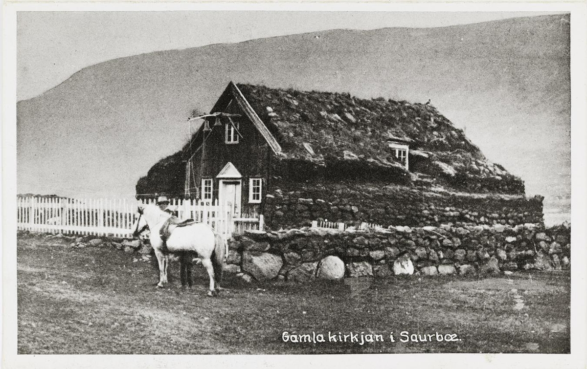 bakvið gráan reiðhest með reiðtygjum. Neðst stendur: Gamla kirkjan í