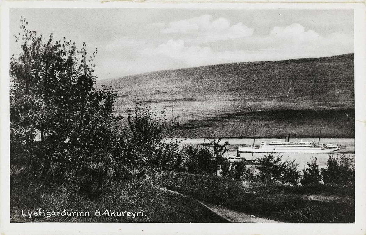 í garði, í baksýn sést stórt skemmtiferðaskip á miðjum firði. Neðst t.v.