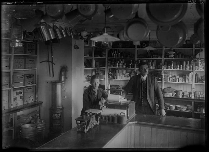 Úr verslun Jens D. Nielsens í kjallara Skjaldbreiðar. Talið frá vinstri: Konráð Gíslason innanbúðarmaður og Jens D. Nielsen. Jens var tengdasonur Peter Nielsens verslunarstjóra hjá Lefolii-verslun og tók Jens við því starfi af tengdaföður sínum. Eftir að Jens hætti verslunarstjórn hjá Lefolii árið 1919 hóf hann rekstur eigin verslunar, en seldi verslunina síðar Sigurði Kristjánssyni.