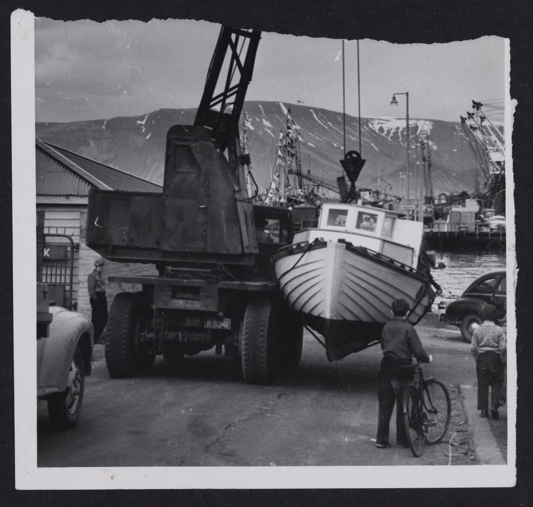 Krani hífir trillu á bryggju. Strákar fylgjast með. Fjall í baksýn.Yfirskrift greinarinnar með myndinni er: Undir myndinni stendur: Trillubátaeigendur í Reykjavík eru nú sem óðast að búa sig undir sumarvertíðina. [...] En eins og myndin ber með sér var nýlega verið að setja bátinn á flot hér í höfninni. Báturinn heitir Gígja og er ljómandi lagleg fleyta, sem vafalaust mun sigla oft með vaska fiskimenn á miðin í leit að þeim gula.