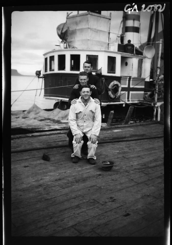 Þrír menn stilla sér þannig upp að sá fremsti, sem klæddur er ljósum samfestingi, beygir sig í hnjánum og styður höndum á þau. Fyrir aftan hann beygir sig dökkklæddur maður og hefur hendur á herðum þess fyrsta. Sá aftasti, einnig dökkklæddur, stendur uppréttur og leggur hendur sínar á axlir miðjumanns. Í bakgrunni sést yfirbygging á fiskiskipi með nótabassaskýli. Ísl. fáninn málaður á brúna. Skipið búið til síldveiða. Tekið á bryggju á Djúpuvík, sjór í bakgrunni.
