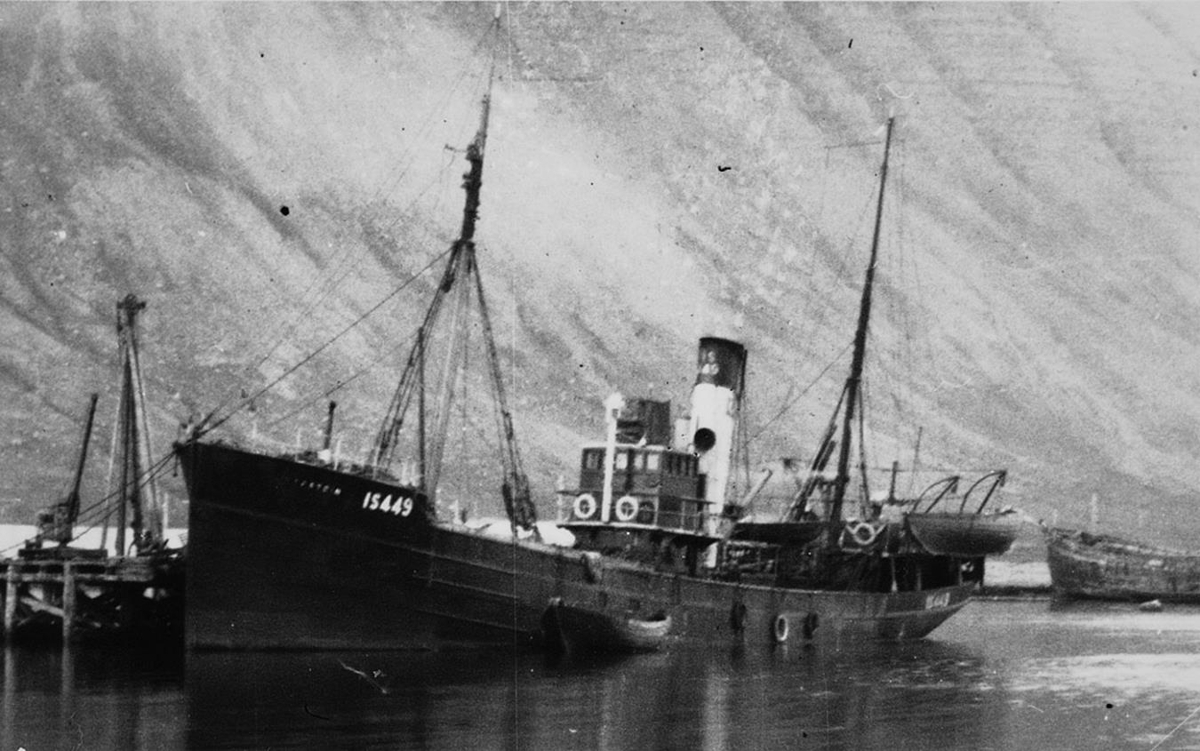 Eftirtaka. Síðutogari, gufuknúinn, liggur við bryggju, við hlið hans er opinn árabátur. Á kinnungnum er nafnið: IS449. T.v. sér í bryggju og t.h. annað skip. Brött fjallsbrekka í bakgrunni.