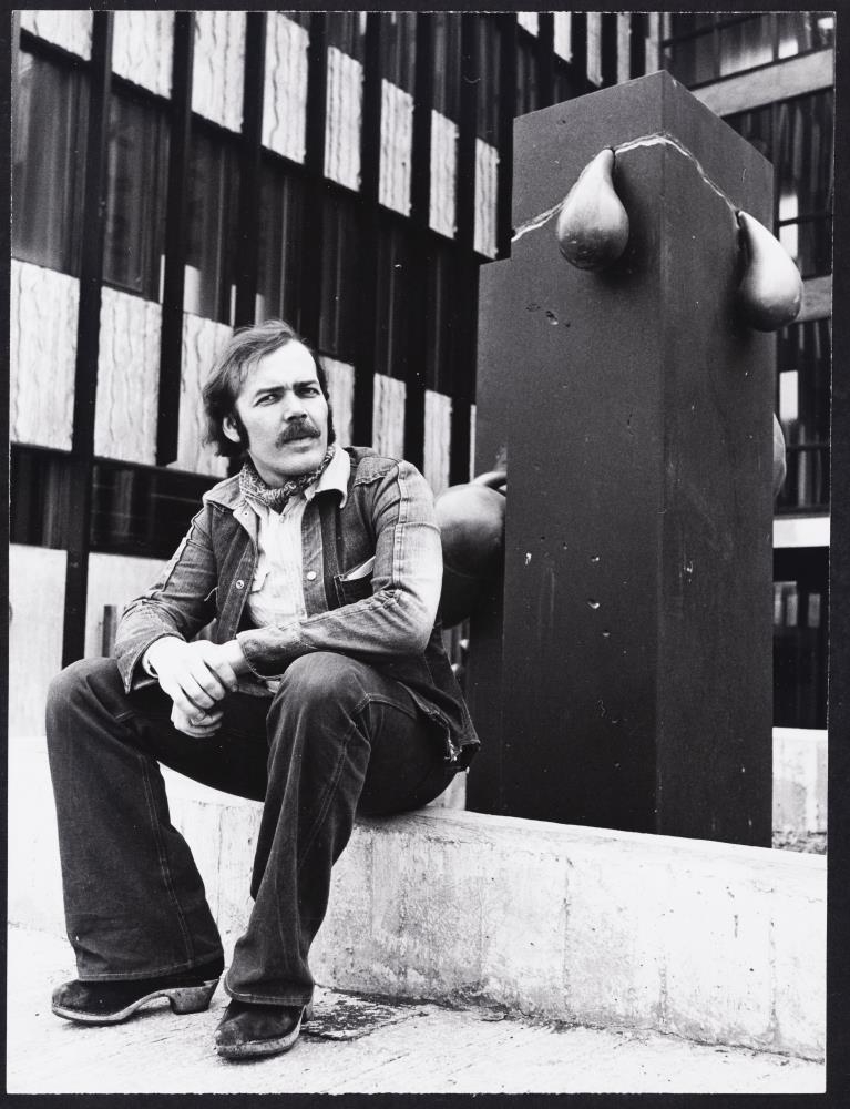 Hús Olíufélagsins. Karlmaður situr í forgrunni. Magnús Tómasson myndhöggvari við verk sitt.