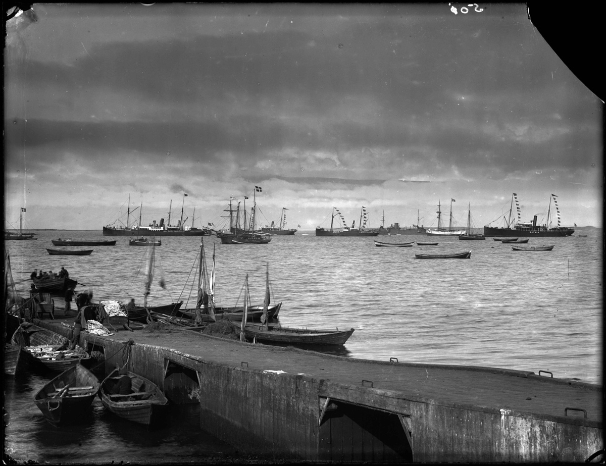 „Tímasetning þessarar myndar fer að verða nokkuð örugg 6. ágúst 1900, þegar hópur 84 danskra stúdenta kom með Botnia til Reykjavíkur. Það má nafngreina flest skipin á myndinni. Til vinstri sést í óþekkt seglskip. Þá koma fjær s.s. CERES (millilanda og strandferðaskip DFDS (Sameinaða Gufuskipafélagsins), og bak við það, breska beitiskipið HMS BELLONA, sem var hér sem gæsluskip (hagsmuna) breskra togara. Landmegin við það eru stór opinn bátur og lítlll gufubátur; Þetta eru líklega flutningaprammi Hvítárvallabarónsins og dráttarbátur hans HVÍTÁ. Þá koma í röð; Næst landi frönsk skonnorta, F25 frá Fécamp. Danska skonnortan ANNA frá Æreskjöping, og yst strandferða skip DFDS s.s. HÓLAR. ANNA var merkilegt skip, 100 brl. 88 nrl. eign Rasmussens skipstjóra, en var hér með flutning fyrir Thomens-verslunina. Hún var smíðuð úr eik í Svendborg 1811 sem jakt, (hét lengst af JULIE) en umbyggð í Marstal 1876 og þá settur á hana skonnortureiði. Hún er því gott dæmi um hve langlíf seglskip gátu orðið ef þeim var vel haldið við. Því næst er gamalt norskt gufuskip DRONNING SOPHIE frá Stavanger, 476 brt. smíðað í Bergen 1873. Það var mikið í förum hér við land undir lok 19. aldar sem leiguskip kaupmanna og var þarna nýkomið með farm frá Bretlandi til Edinborgarverslunar. Aftan við það er danska varðskipið Hejmdal (Heimdallur), sem hér var ca 7-8 mánuði á ári við gæslu. Aftan við Heimdall sést norska seglskipið Progress frá Stavanger, sem sömuleiðis kom með vörur til Edinborgarverslunar. Lengst til hægri er svo BOTNIA með stúdentana, og eru skipin fánum prýdd til að fagna þeim. Svo mikils var nú stúdentsnafnbótin verð í denn. “ (BÞ 2017)