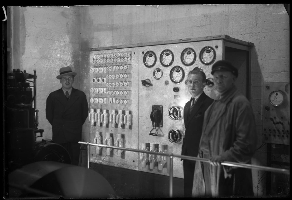 Þrír menn standa við stóra rafmagnstöflu. Lengst t.v. er maður í jakkafötum, með bindi og hatt. Til hægri ungur maður, berhöfðaður í jakkafötum með bindi. Þá maður í slopp með kaskeiti sem heldur um handrið. Til vinstri sér á vél.