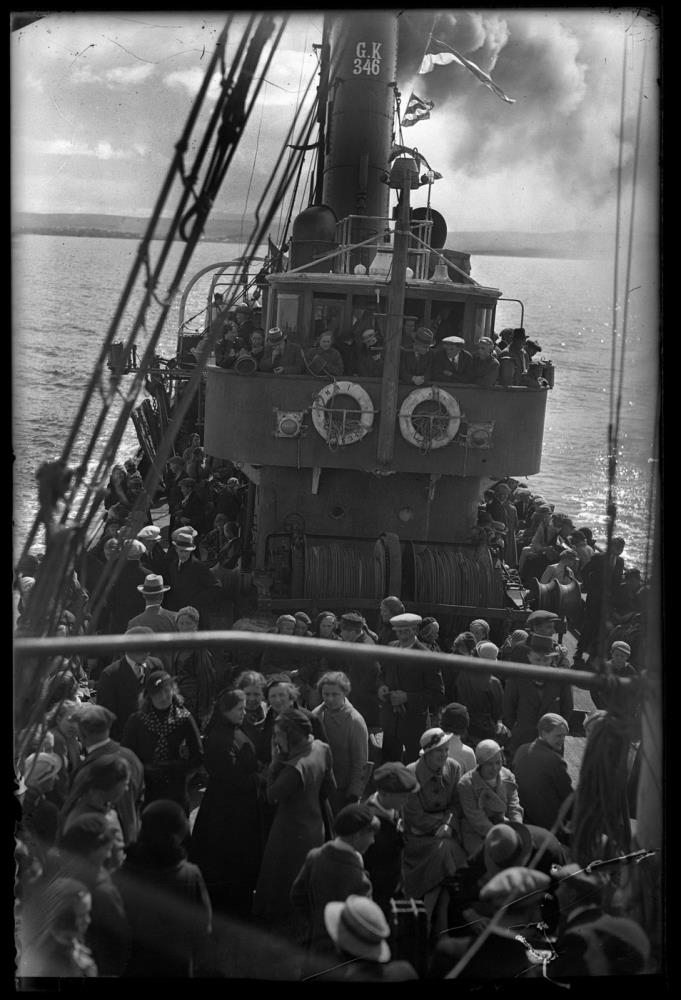 Um borð í togara og sér aftur eftir skipinu: Dekk, spil, brú, brúarvæng. Fjöldi fólks á dekki og brúarvæng. Í forgrunni stag frá mastri. Tveir ljósir björgunarhringir framan á brúarvæng og á þeim stendur "Maí ...K 34...".